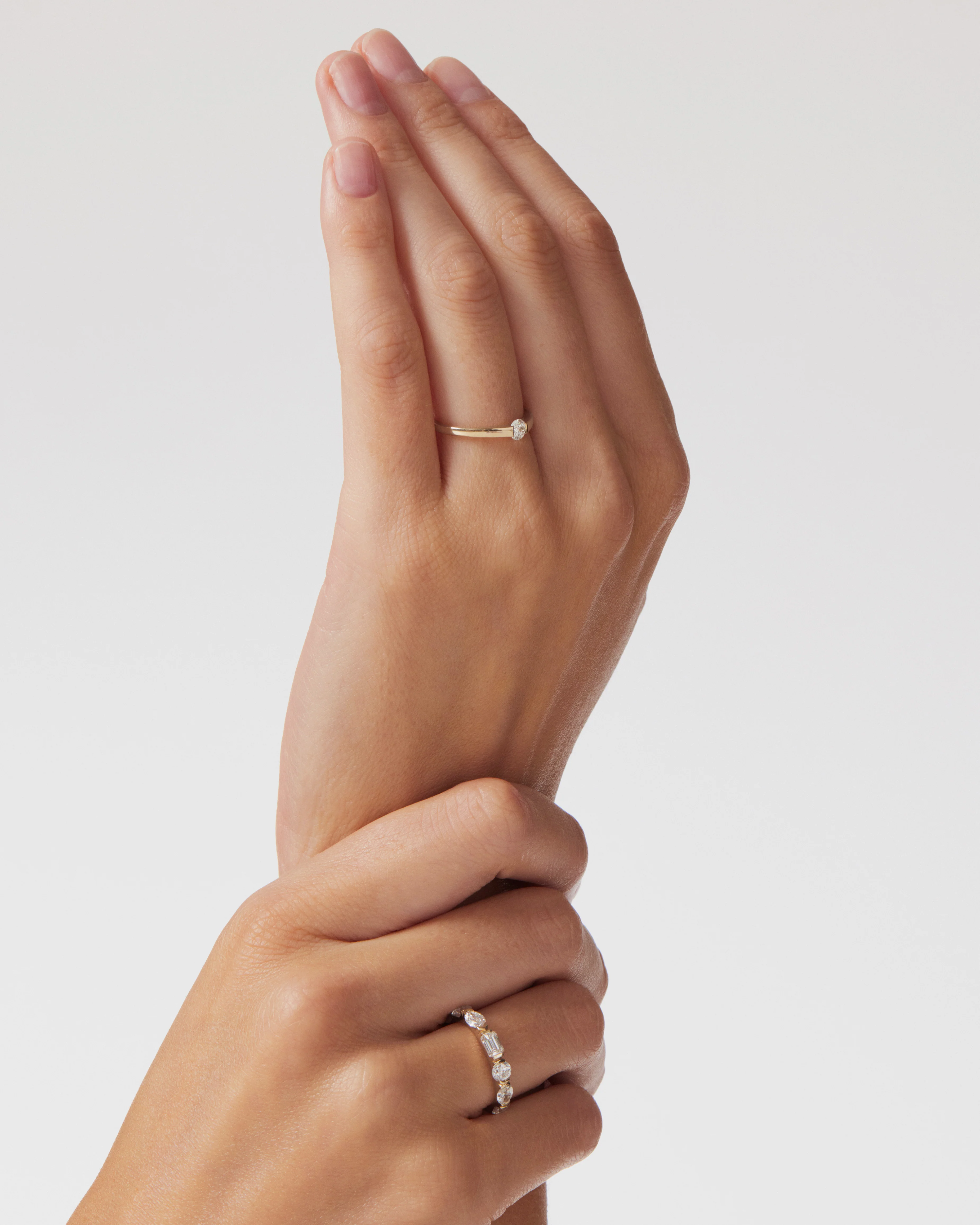 Featuring seven diamonds in five different cuts – round, marquise, oval, pear and emerald – this bold ring embraces clean lines, with each stone appearing to float between suspense-style settings.