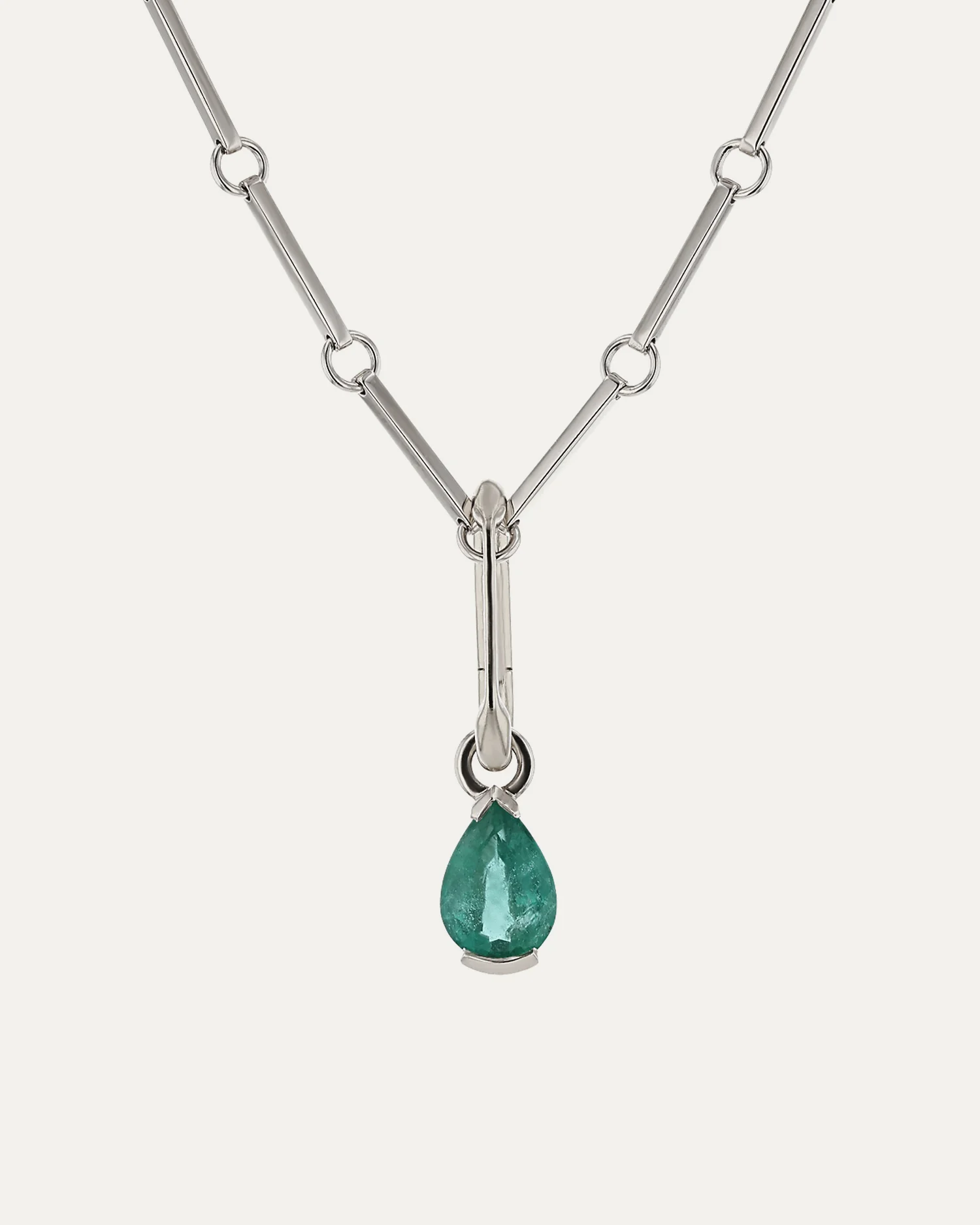 Crafted in 18 karat gold, the Emerald Pear Carabiner features a glowing 1.34-carat pear-cut Zambian emerald suspended from a secure carabiner-style loop. Designed to hang loosely, threaded through our collection of textured chains. This standout piece can be made bespoke, requiring a minimum 1-carat emerald order (price on application).