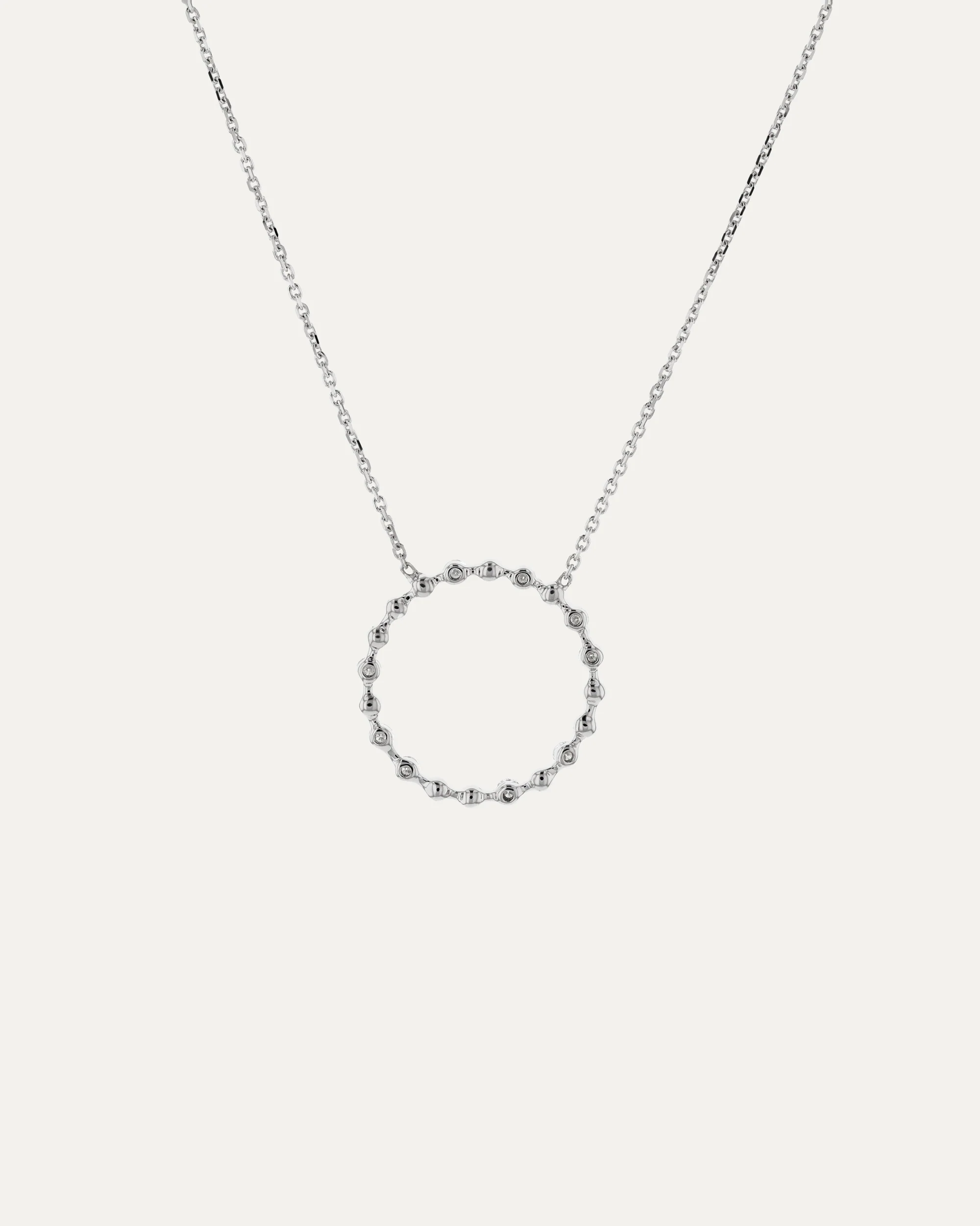 Handcrafted in sterling silver, the Medusa Necklace features a circular motif adorned with polished silver beads and natural white diamonds. Suspended from our signature fine chain, it creates a considered silhouette perfect for everyday wear or occasion styling.