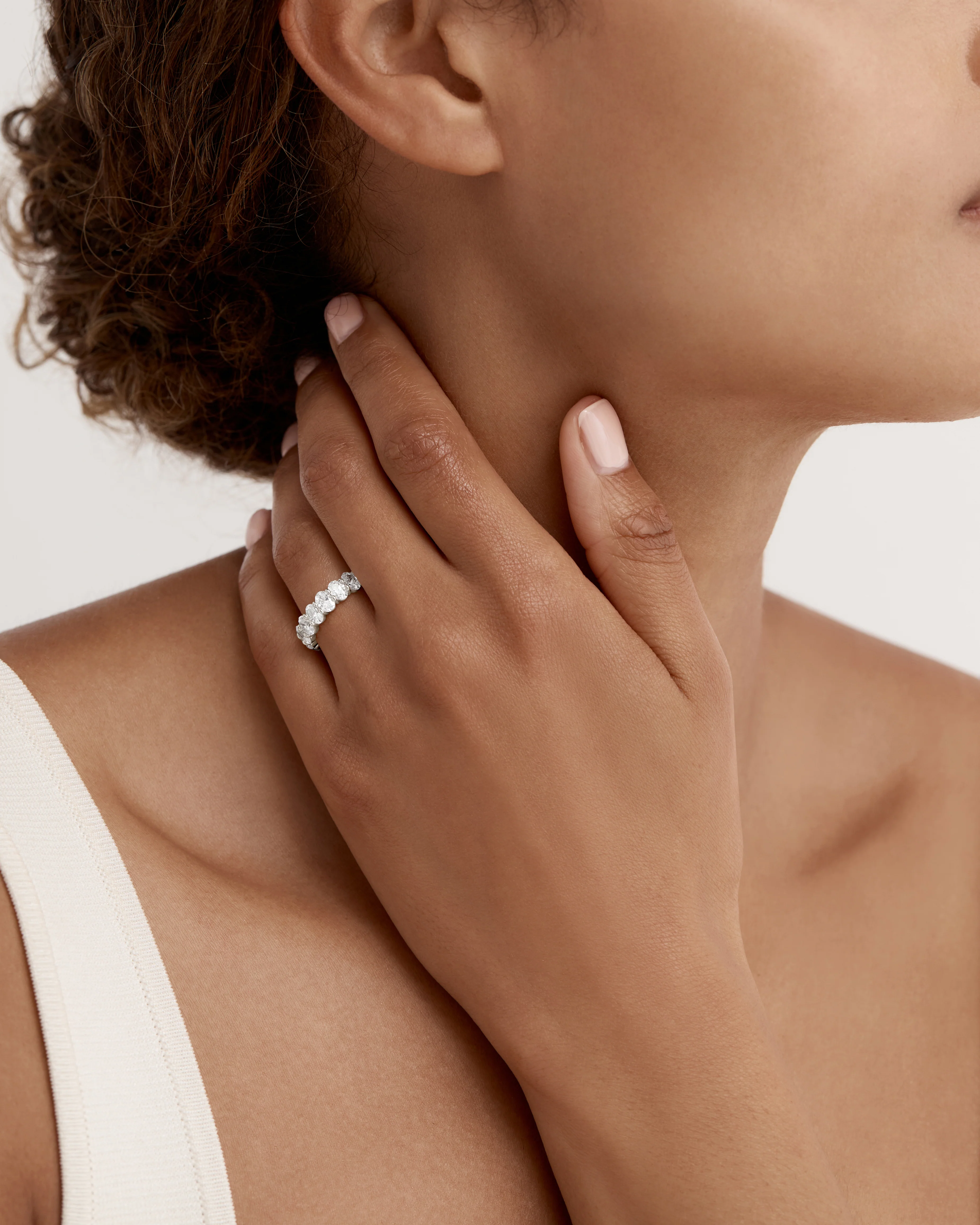 A sophisticated modern wedding band or a standout piece to treasure forever, this ring features a uniform cluster of oval diamonds set vertically along 3/4 of an 18-karat gold band.